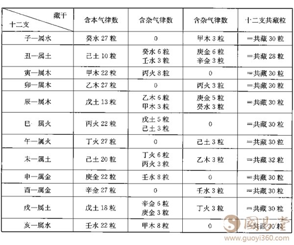 在圆周上,每天干作为十分之一等分,为36度,故为36粒;每地支作为十二分之一等分,为30度,故藏物也为30粒。由于地支藏干,对H二地支内部作进一步的分配:这是原律数。在进入八字结构以后,要经过以下的运算: