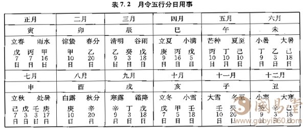 在隋朝萧吉的《五行大义》冲,我们已经看到当时对“五行四时主事”的认识。具体来说,五行中水、火、金.水,各主春、夏秋、冬四季的前72天;土则主四季的最末18天,加在一起也是 72天,由此来描写五行在四季时序中所经历的变化(见第五章表5.2)。《珞球子三命消息赋》的徐子平注本对此作了肯定。而《渊海子平》则深化了这种认识,在前人的基础.上,作出了更精细的分析,称为“月令五行分日用事",可以图示如下: