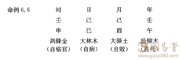年柱杨柳弱木,生于八月,金神当权,而木神失令。纵然有大林木助身,但巳酉半会金局。剑锋金得大驿土亦滋其势,再加上己已合起壬申(已申六合),为祸伤身。“故二十八岁,溺水而死。”《三命通会》同样有古歌日:“五行遇战主多更,相对相冲便斗争。斗若不赢翻作祸,力停须看两相登。刑冲战斗论输赢,四柱偏颇力不停。鱼腹有灾防溺水,鼠牙莫近恐遭刑。”