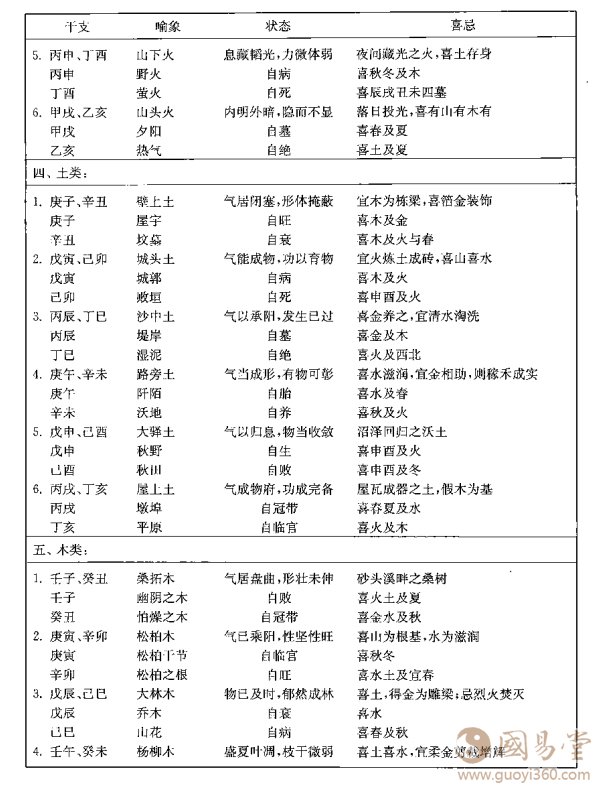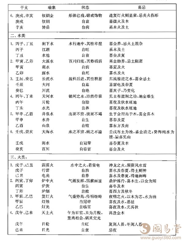 详此十有二位,先后甲子,可以次第而晓。比如,上面金类的六组于支,甲子、乙丑,取象海中之金,因为此时气在包藏,有名无形。壬寅、癸卯,绝地存金,气尚柔弱,称为金箔金。庚辰、辛巳,气已发生,寄形生养之乡,受西方之正色,故曰白蜡金。甲午.乙未,则气已成物,混于沙而别于沙,居于火而炼于火,故称沙中金。壬申、癸酉,气盛物极,成颖脱锋锐之刃,故取象剑锋,而金之功用极矣。至戌亥则金气藏伏,形体已残,锻炼首饰,藏之闺阁,而金之功用毕,故庚戌、辛亥,名之钗钏金.