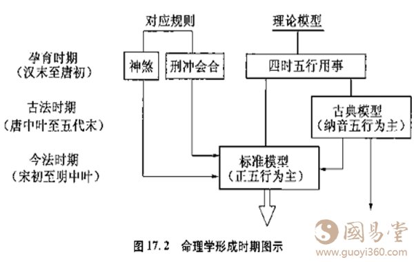 从东汉末到明朝中叶,这近1 400年的漫长岁月,是命理学形成的历史时期。我们把它分为三个阶段:孕育时期,古法时期和今法时期。各时期的主要内容可以图示如下:
